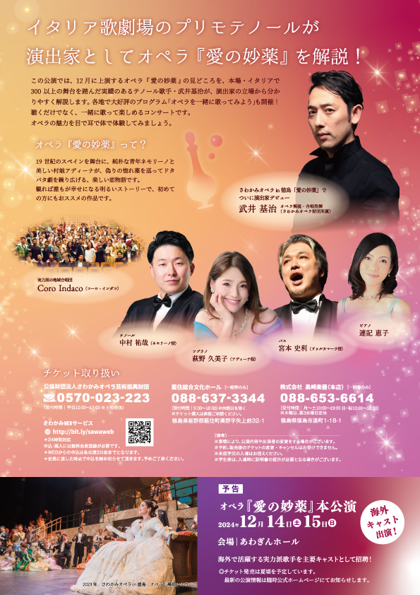 令和6年12月に開催する『さわかみオペラin徳島「愛の妙薬」』公演をより楽しんでいただくためのプレイベント。